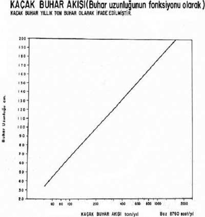 Grafik, kaçak buhar akışı oranını (ton/yıl) buhar uzunluğunun (cm) bir fonksiyonu olarak vermektedir .Grafikteki doğru, yıllık 8760 çalışma saati baz alınarak verilmiştir. Buhar uzunluğu buharın avuç içinde su damlacıkları oluşturdukları noktaya kadar olan uzaklıktır. Bu uzunluk da gözle görülebilir buhar uzunluğundan biraz daha fazla olabilir. Buharın maliyetini biliyorsanız (bakınız Teknik Bilgiler Serisi 11) buhar uzunluğunu ölçerek buhar kaçağının yıllık maliyetini kolayca hesaplayabilirsiniz.