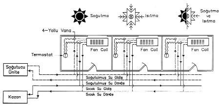 Bu sistemde soğuk su gidiş-dönüş ve sıcak su gidiş-dönüş olmak üzere 4 boru mevcuttur. Ayrıca drenaj borusu da kullanılmaktadır. Terminal ünitelerde genelde biri ısıtıcı biri de soğutucu olmak üzere 2 ayrı serpantin mevcuttur. Bu sistemde primer taze hava için veya sekonder su devrelerinde zonlama yapmaya gerek kalmamaktadır. Sistemin özelliği aynı zaman diliminde farklı sıcaklıklar hisseden bölgelerde dizayn edilen konfor şartlarına ulaşmamızdır. Şöyle ki; bir dış çevre cephe veya zonda ısıtma diğer bir dış çevre cephe veya zonda da soğutma yapmamız mümkün olmaktadır (Şekil 9).