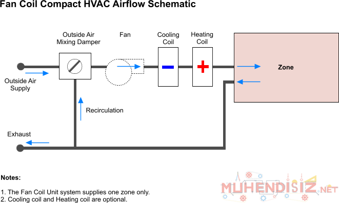 Fan tarafından filtreden geçerek emilen hava serpantin yüzeyini yalayarak ortama üflenir. Fancoil üniteleri kasetli veya kasetsiz tip olarak imal edilmekte olup, pencere önüne asma tavan içine veya pencere önünde bir kaşe içine yerleştirilebilmektedir. Çok katlı ofis binaları, oteller, moteller ve hastanelerde kullanılmaktadır. Fan-coil sistemlerinin ana problemi olarak dile getirilebilecek ana konular mahallerdeki taze hava ihtiyaçları karşısında çaresiz kalmaları ve de ses seviyeleridir. Dış ortamla yapılacak kontrolsüz bir fiziksel bağlantı yerine, ihtiyaç duyulan taze havayı merkezi olarak şartlandıran ve mahallere dağıtan bir primer havalandırma sisteminden bahsetmek daha doğru olacaktır.