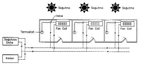 2 borulu fan-coilde serpantinden kışın sıcak su (ısıtma amaçlı), yazın ise soğuk su (soğutma amaçlı) geçilir. Kısaca 2 borulu fan-coil sistemi mevsime göre ya ısıtır ya da soğutur (Şekil 8). Yurdumuzda pek çok uygulama alanı bulunmasına karşın dünyada kullanımı gerilemektedir.