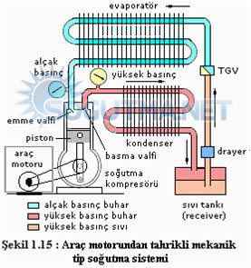 Soğutucu akışkan kompresör-kondenser ve kondenser-genleşme valfı arasında yüksek basınç altında, genleşme valfı-evaporatör ve evaporatör-kompresör arasında da alçak basınç altında bulunur. Şekil 31.22’de mekanik tip araç soğutma sistemine ait soğutma devresi ve devre elemanları görülmektedir. Kompresör devrede soğutma isini gerçekleştirebilmek için iki taraf arasında bu basınç farkını yaratmak amacıyla kullanılan devre elemanıdır.