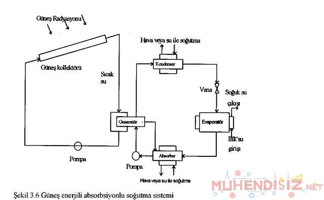 Absorpsiyonlu soğutma çevriminde, soğutucu akışkan ve soğutucu akışkan gazını absorblayan sıvı akışkan (absorbent) bulunur. Şekil 6-13’ de görüldüğü gibi güneş enerjili absorbsiyonlu soğutma sistemi; generatör, absorver, evaporatör, kondenser gibi dört ana elemanın yanında eriyik pompası, genleşme ve kısma vanasından oluşmaktadır. Absorberde bulunan çözelti, bir sıvı pompası ile basılçlandırılarak generatöre gönderilir. Güneş enerjisinden sağlanan ısı ile soğutucu akışkan absorbentten ayrılır. Generatöre ısı verilerek karışımdan ayrılan soğutucu geçer. Sıvı haldeki soğutucu akışkanın basıncı düşürülerek evaporatöre gönderilir. Burada basıncı düşen soğutucu akışkan ortam ısısını alarak buhar haline geçer ve absorbere ulaşır.
