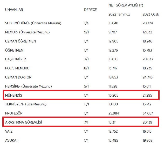 | Unvan | Derece | 2023 Ocak | 2023 Temmuz |