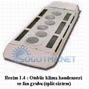 Otobüs klimaları split tip cihazlardır. Hava soğutmalı kondenser ünitesi aracın üst kısmına ince ve uzun bir gövde içine, aerodinamik yapıyı bozmayacak şekilde yerleştirilmiştir. Soğutmada kullanılan kompresör aracın motorundan tahrikli olabildiği gibi, bir çok uygulamada soğutma kompresörünü süren ayrı bir dizel motor vardır. Termostatik kontrollü devreye giren ve çıkan bu sistem otomatik olarak çalışmaktadır. Araç motorundan tahrikli olanlarda manyetik kavrama kullanılır.