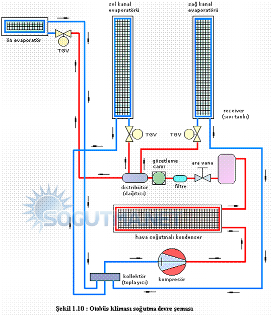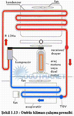 Şekil 1.13’te otobüs klimasına ait çalışma prensibi ve soğutma çevrimi şematik olarak verilmiştir.