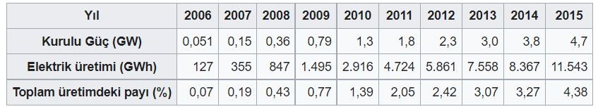 2015 yılında rüzgâr ile elektrik üretimi, Türkiye toplam tüketiminin %4,38’ini karşılamıştır ve 11.543 GWh (gigawatt.saat) rüzgârdan elektrik üretmiştir. 2015 yılı ilk 11 ayında tüketim karşılama oranı %4,37 seviyesindedir. 2015 sonu itibarıyla işletmede olan rüzgâr enerji santralarının kurulu gücü ise 4.718,3 MW’tır. (Kaynak: Wikipedi)