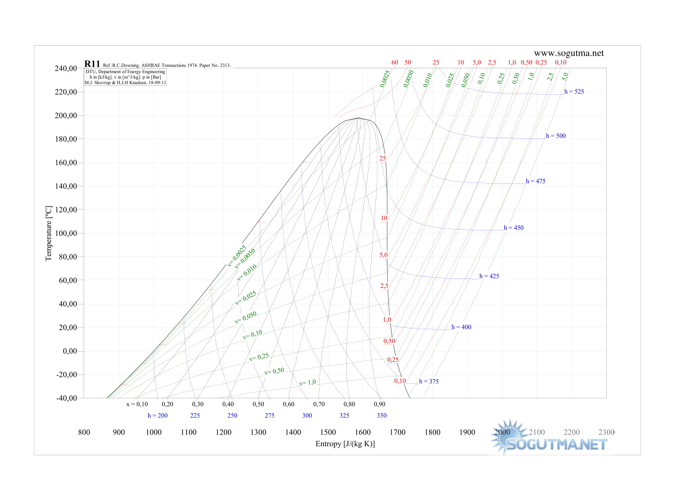 R11 (Freon 11) Soğutucu akışkan için Sıcaklık – Entropi ( T – S ) diyagramı aşağıdaki yer almaktadır. Resmin üzerine tıklayarak büyük boyutta incelebilirsiniz.