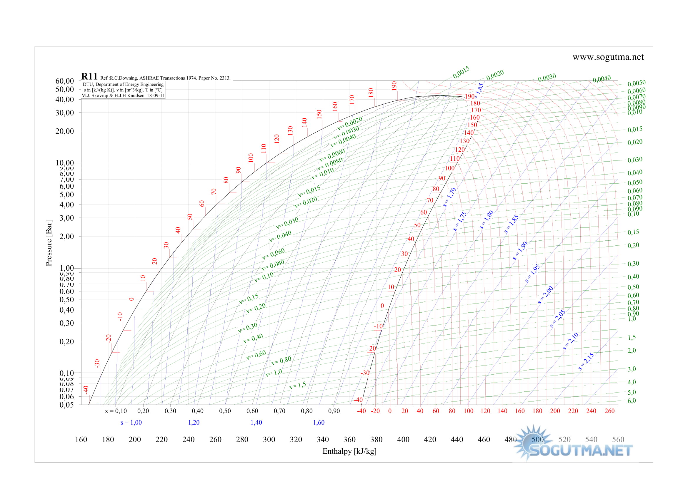 R11 (Freon 11) Soğutucu akışkan için Basınç - Entalpi ( P - H ) diyagramı