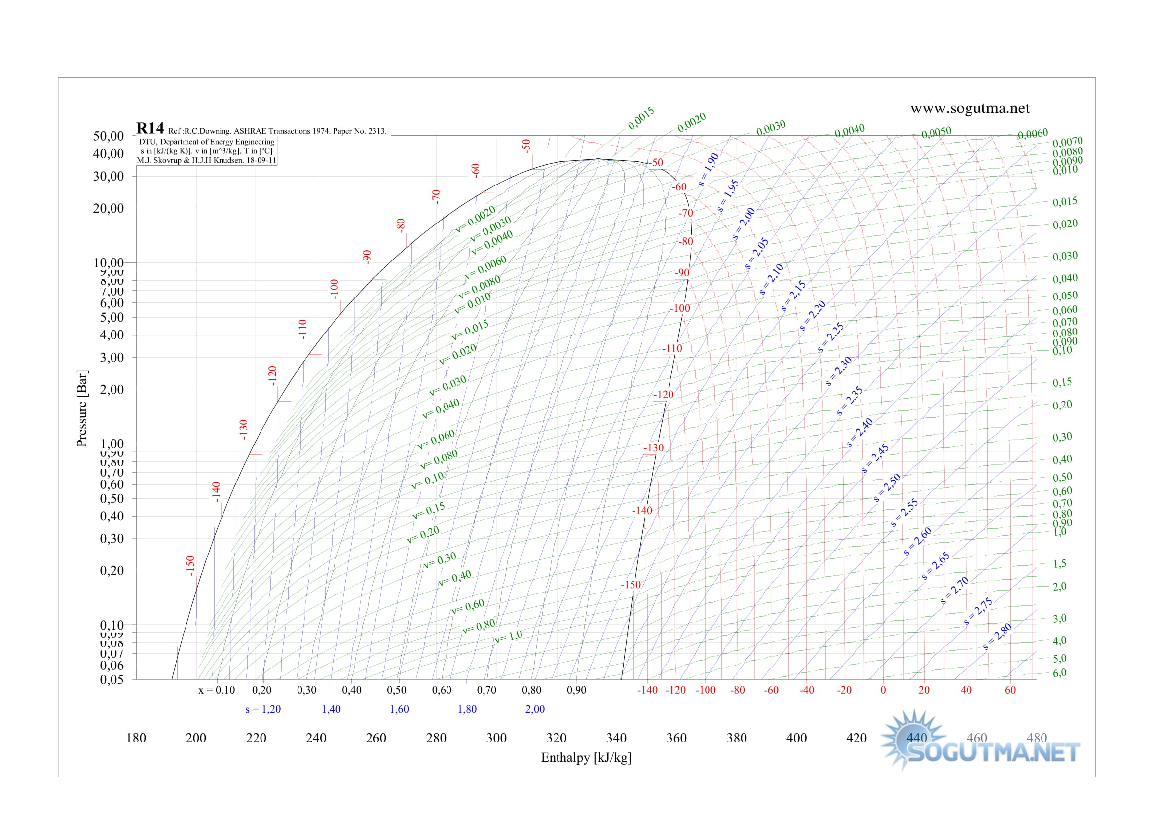 R14 (Freon 14) Soğutucu akışkan için Basınç – Entalpi ( P – H ) diyagramı aşağıdaki yer almaktadır. Resmin üzerine tıklayarak büyük boyutta incelebilirsiniz.