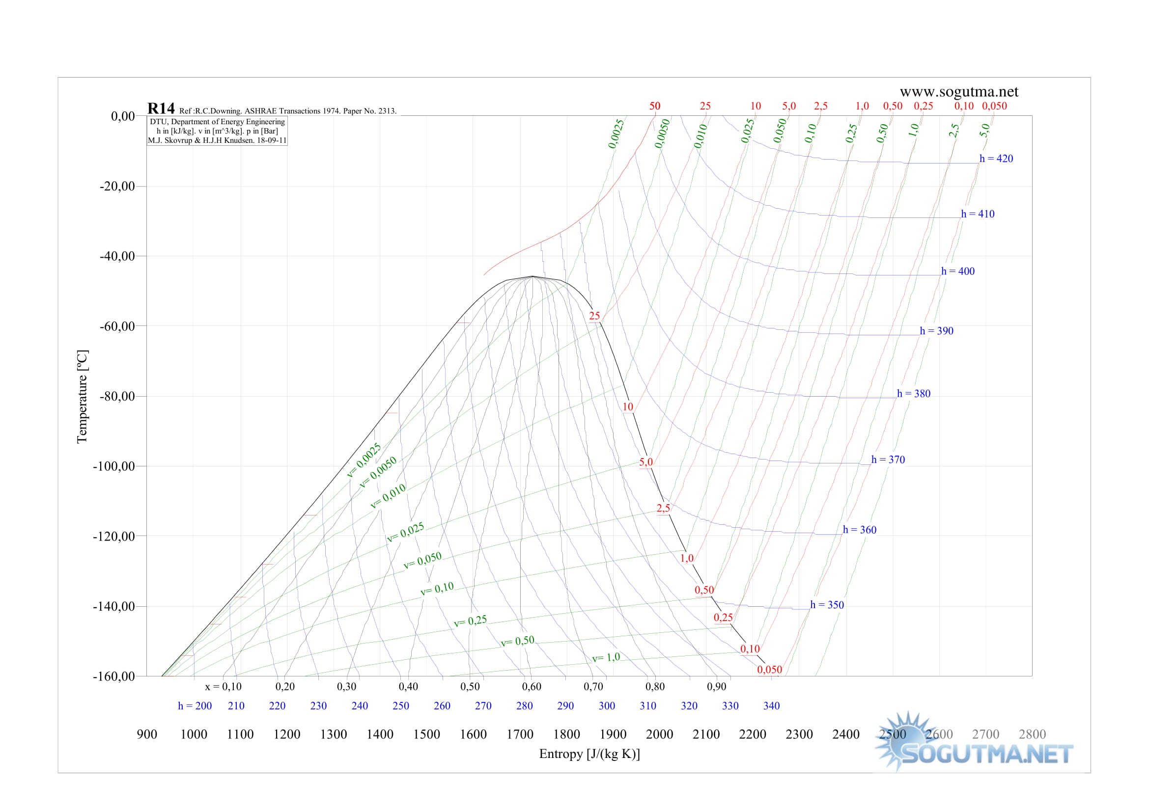 R14 (Freon 14) Soğutucu akışkan için Sıcaklık – Entropi ( T – S ) diyagramı aşağıdaki yer almaktadır. Resmin üzerine tıklayarak büyük boyutta incelebilirsiniz.