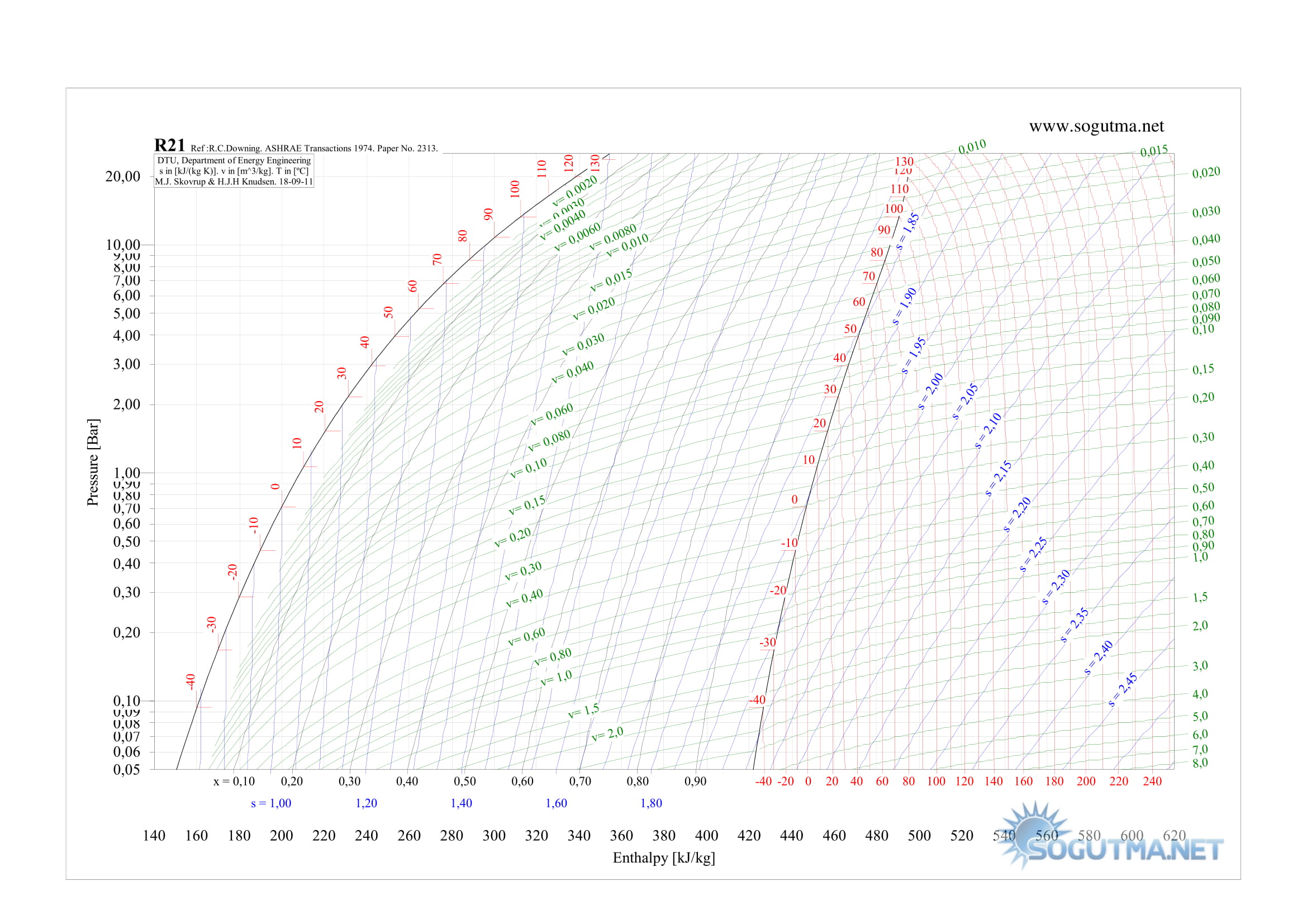 R21 (Freon 21) Soğutucu akışkan için Basınç – Entalpi ( P – H ) diyagramı aşağıdaki yer almaktadır. Resmin üzerine tıklayarak büyük boyutta incelebilirsiniz.