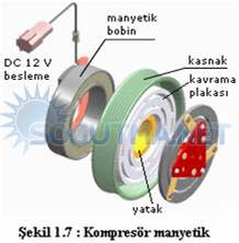 Otomobil klima kompresörleri bir kavrama mekanizması yardımıyla otomobilin motorundan hareket alırlar. Soğutma kompresörü otomobil motor krank şaftına, kayış kasnak bağlantılı olarak çalışır. Kompresör şaftındaki kasnağına bağlı olan kavrama, elektromanyetik olarak çalışan basit bir mekanizmadır. Bu parçalı mekanizma, manyetik kavrama olarak isimlendirilir. Doğru akımla beslenen bobin devresi yüksek bir manyetik çekme kuvveti oluşturur. Termostatik olarak bağlı bir sensör üzerinden enerjilendiğinde, kavrama gerçekleştirilir. Buna ait fonksiyonel yapı Şekil 1.7’de görülmektedir.