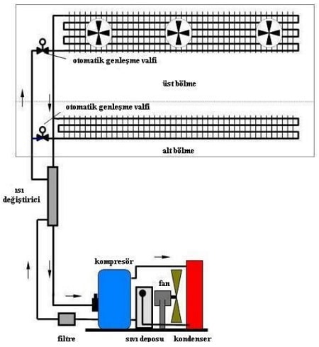 Kompresörde sıkıştırılan soğutucu akışkan, kondenserde yoğunlaştırılır ve sıvı deposunda toplanır. Sıvı deposundan sonra filtreden geçen soğutucu akışkan, daha sonra genleşme vanalarında genleştirilir. Evaporatörde buharlaşan soğutucu akışkan tekrar kompresör tarafından geri emilir. Soğutulan hava, evaporatörlerin üzerindeki fanlar yardımıyla ortamda dolaştırılır. Sistemde, aksesuar olarak yağ ayırıcı ve ısı değiştirici kullanılmıştır.