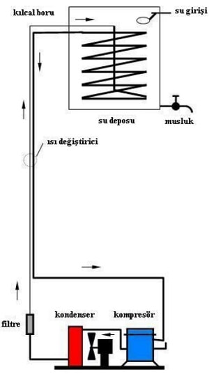 Kompresörde sıkıştırılan gaz, kondenserde yoğunlaşır, filtreden geçtikten sonra kılcal boruya gelir. Sıvı soğutucu akışkan, su içinde bulunan boru kangalı içinde buharlaşırken suyu soğutur. Buharlaşan akışkan, emme hattı vasıtasıyla tekrar kompresöre döner. Serpantini su haznesinin dışında olan sebiller de mevcuttur. Bunlarda bakır borular, haznenin dışına temas hâlindedir.