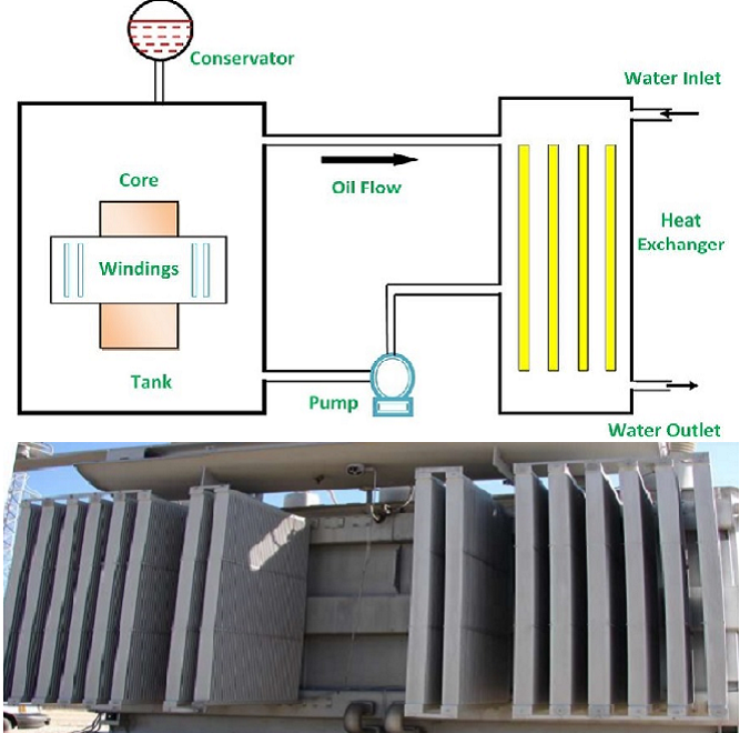 Isı kapasitesi yüksek olan bir malzeme daha yavaş ısınır ve soğur. Suyun öz ısı kapasitesi havadan daha fazla olduğu için aynı hava koşulları altında suyun sıcaklığı, havanın sıcaklığının çok daha altındadır. Bu nedenle su, havadan daha iyi bir ısı eşanjörü olarak kullanılabilir. OFWF tip soğutma yönteminde, sıcak yağ, bir yağ pompası vasıtasıyla ısı eşanjörüne gönderilir. Isı eşanjörünün içerisindeki borularda dolaşan sıcak yağ, su ile ısı değişimi yaparak soğur. Bu sistemde yağın soğuması daha hızlı bir şekilde gerçekleşir. Bu soğutma türü genellikle çok büyük transformatörlerde kullanılır.