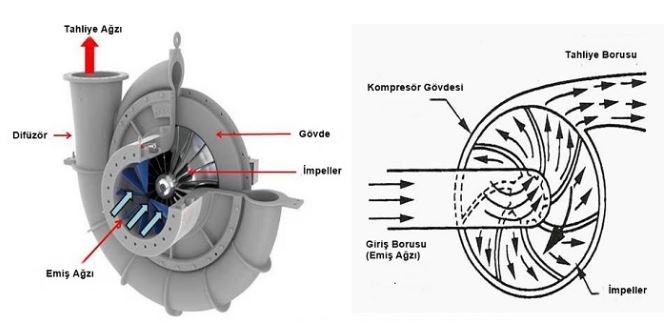 Gaz türbinleri: Gaz türbinleri, havadaki gerekli sıkıştırmayı sağlamak için aksiyal ve santrifüjlü (turbo) kompresörlerden birini kullanır. Turbo kompresörler çoğunlukla turboshaft, turboprop, mikro türbinler ve yardımcı güç ünitelerinde kullanılır.
